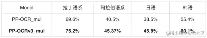 在多语言场景,基于PP-OCRv3训练的模型,在有评估集的四种语系,相比于PP-OCRv2,识别准确率平均提升5%以上,如下表所示。同时,PaddleOCR团队基于PP-OCRv3更新了已支持的80余种语言识别模型。