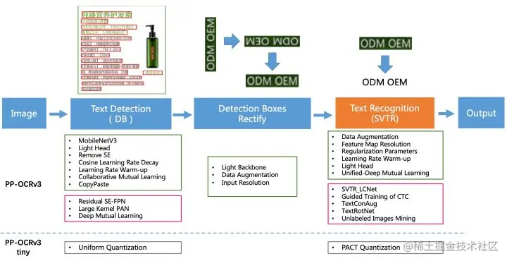 全新升级的PP-OCRv3的整体的框架图(粉色框中为PP-OCRv3新增策略)如下图。检测模块仍基于DB算法优化,而识别模块不再采用CRNN,更新为IJCAI 2022最新收录的文本识别算法SVTR (论文名称:SVTR: Scene Text Recognition with a Single Visual Model,arxiv.org/abs/2205.00… ),并对其进行产业适配。