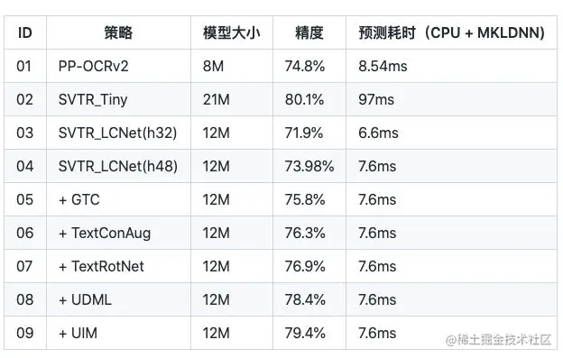 PP-OCRv3的识别模块是基于文本识别算法SVTR优化。SVTR不再采用RNN结构,通过引入Transformers结构更加有效地挖掘文本行图像的上下文信息,从而提升文本识别能力。直接将PP-OCRv2的识别模型,替换成SVTR_Tiny,识别准确率从74.8%提升到80.1%(+5.3%),但是预测速度慢了将近11倍,CPU上预测一条文本行,将近100ms。因此,如下图所示,PP-OCRv3采用如下6个优化策略进行识别模型加速,消融实验如下表所示。