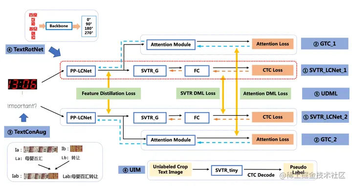 UDML(Unified-Deep Mutual Learning)联合互学习是PP-OCRv2中就采用的对于文本识别非常有效的提升模型效果的策略。在PP-OCRv3中,针对两个不同的SVTR_LCNet和Attention结构,对他们之间的PP-LCNet的特征图、SVTR模块的输出和Attention模块的输出同时进行监督训练。使用该策略,识别模型的准确率进一步提升到78.4%(+1.5%)。
