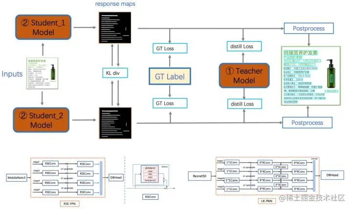 PP-OCRv3检测模块对PP-OCRv2中的CML(Collaborative Mutual Learning) 协同互学习文本检测蒸馏策略进行了升级。如下图所示,CML的核心思想结合了①传统的Teacher指导Student的标准蒸馏与 ②Students网络之间的DML互学习,可以让Students网络互学习的同时,Teacher网络予以指导。PP-OCRv3分别针对教师模型和学生模型进行进一步效果优化。其中,在对教师模型优化时,提出了大感受野的PAN结构LK-PAN和引入了DML(Deep Mutual Learning)蒸馏策略;在对学生模型优化时,提出了残差注意力机制的FPN结构RSE-FPN。消融实验如下表所示。