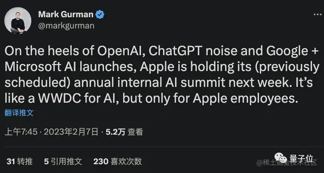 据彭博社记者Mark Gurman推特爆料,在OpenAI、微软和谷歌的一系列动作之下,苹果也将于下周发起一场年度AI峰会。