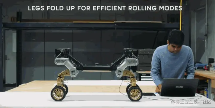 当TIGER 的腿收回后,它就像一个四轮驱动的车辆,可以靠滚动牵引力移动,处于最高效的模式。