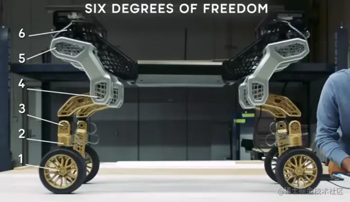 TIGER有四条「腿」,每条「腿」都有一系列的关节,包含6个自由度,使它能够模仿哺乳动物和爬行动物的步态。