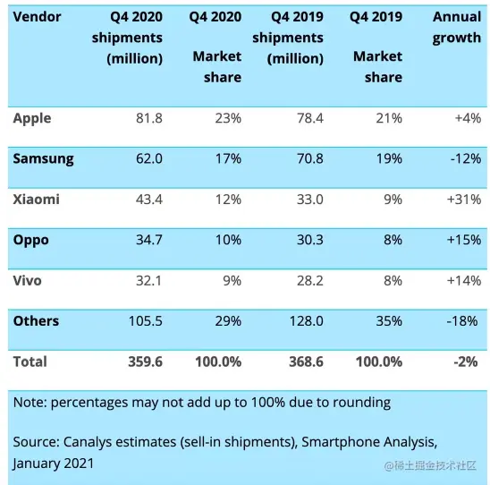 除了苹果和三星之外,其他几家国产手机表现也可圈可点,尤其是小米。小米在2020年第四季度的销量超4300万部,排名第三,与2019年第四季度相比,小米智能手机销量增长了33.9%,这在上榜的5家中,增幅最大。