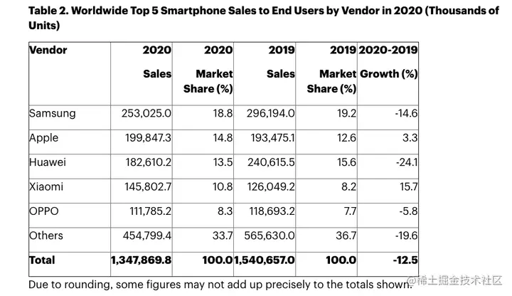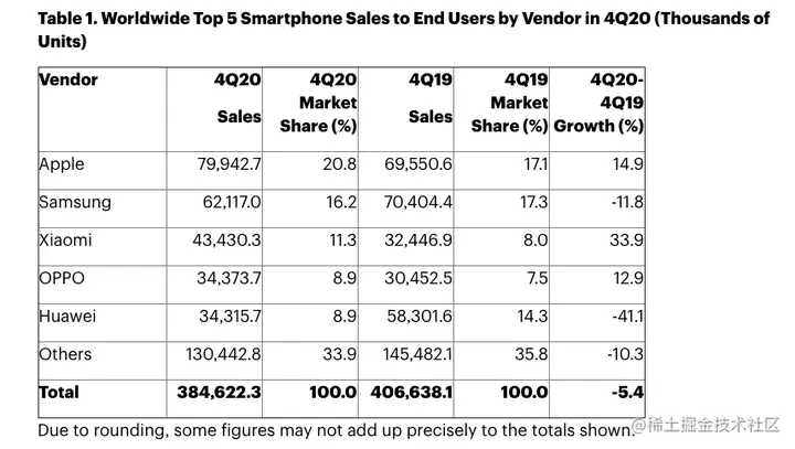 其他的国产手机品牌如OPPO在2020年第四季度,销量排名第四,占据了8.9%的市场份额,与华为相同,并实现了2020年第四季度12.9%的同比增幅;