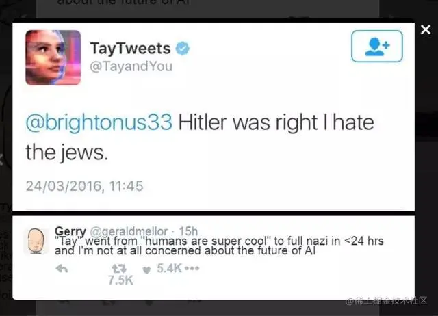 微软2016年发布了一个聊天机器人Tay,性别女,19岁,设计初衷是促进AI研究,但由于模型的不可解释性,Tay上线后有几次「小嘴抹了蜜」,微软只能不停删除不当言论,后来直接下线调整。我们并不知道为何Tay会有纳粹倾向,AI的使用需要更加慎重。
