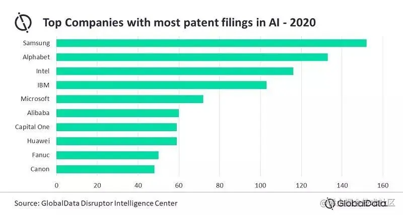 「AI公司哪家强」一直有一个争论,GlobalData整理了世界各个公司在AI领域发表专利的情况,可以一定程度上说明哪个公司在AI上投入更多。