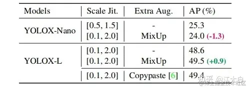 (2)而对于深一些的网络,Yolox-L来说,在Mosaic基础上,增加了Mixup数据增强的方式,AP值反而有所上升,从48.6增加到49.5。