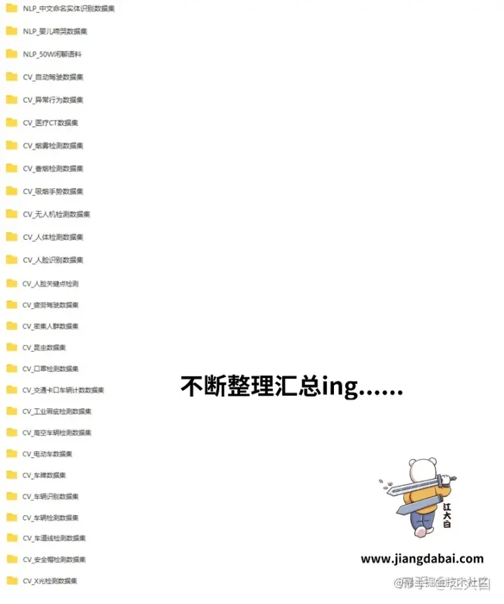 为了便于大家查找相关数据集,大白将梳理的所有的数据集进行汇总,便于大家对应查看。