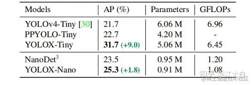 (1)和Yolov4-Tiny相比,Yolox-Tiny在参数量下降1M的情况下,AP值实现了9个点的涨点。