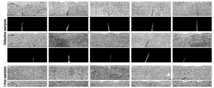 - “无缺陷”图像显示的背景纹理没有缺陷,“无缺陷”图像的背景纹理上恰好有一个标记的缺陷。