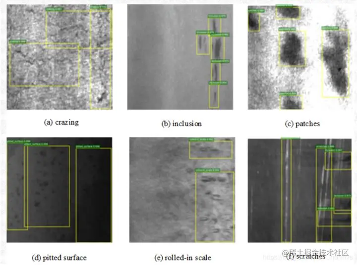 由东北大学(NEU)发布的表面缺陷数据库,收集了热轧钢带的六种典型表面缺陷,即轧制氧化皮(RS),斑块(Pa),开裂(Cr),点蚀表面( PS),内含物(In)和划痕(Sc)。该数据库包括1,800个灰度图像:六种不同类型的典型表面缺陷,每一类缺陷包含300个样本。对于缺陷检测任务,数据集提供了注释,指示每个图像中缺陷的类别和位置。对于每个缺陷,黄色框是指示其位置的边框,绿色标签是类别分数。