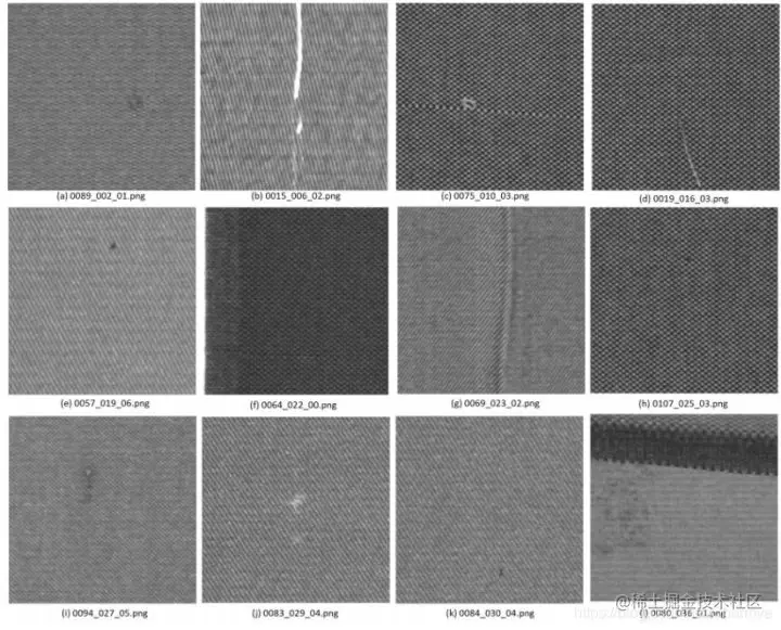 该数据库由七个不同织物结构的245张4096 x 256像素图像组成。数据库中有140个无缺陷图像,每种类型的织物20个,除此之外,有105幅纺织行业中常见的不同类型的织物缺陷(12种缺陷)图像。图像的大尺寸允许用户使用不同的窗口尺寸,从而增加了样本数量。Internet上的数据库还包含所有具有缺陷的图像的分割mask,使得白色像素表示缺陷区域,其余像素为黑色。