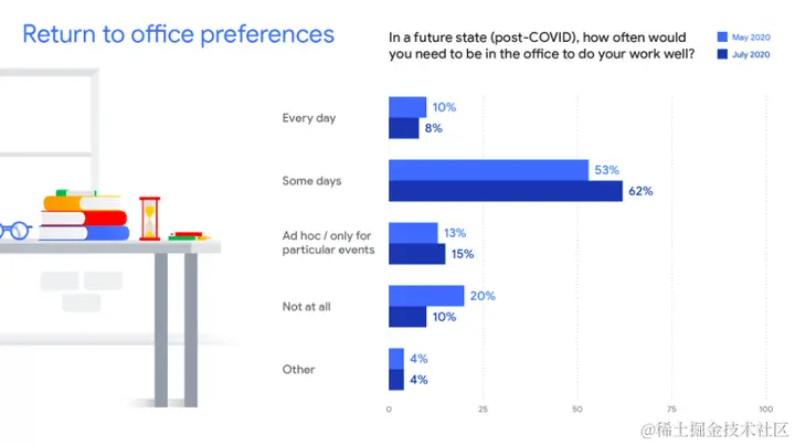 所以,谷歌就开始研究「混合模式」,包括重新安排办公室、制定更多的长期远程办公选择。