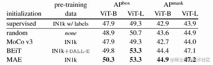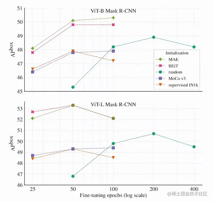 对于ViT-B来说,BEiT与MAE均优于随机初始化与有监督预训练;