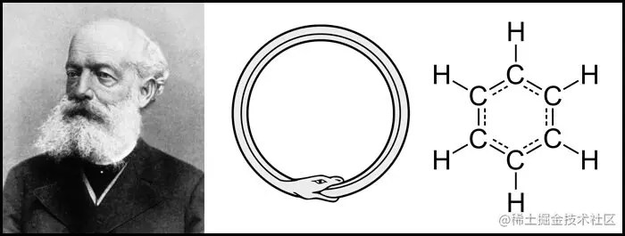 19世纪的德国化学家AugustKekulé声称自己梦见一条蛇吃着自己的尾巴,使他发现了苯分子的环状结构。当时,其他科学家还都认为分子都将遵循直线结构。