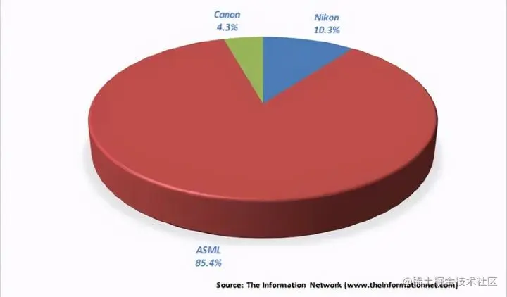 全球三大光刻机大厂中,ASML约占75%、尼康和佳能各自占10%左右,三者合计的市占率逼近 95%.
