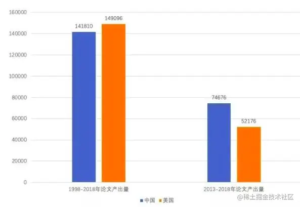 同时,中国发表AI论文的数量逐年增加,2013-2018年间,中国AI论文发表的数量比美国还要多出2万多篇。中国发表的论文数量明显要多,但是就论文质量方面而言,距美国还有很大的差距。