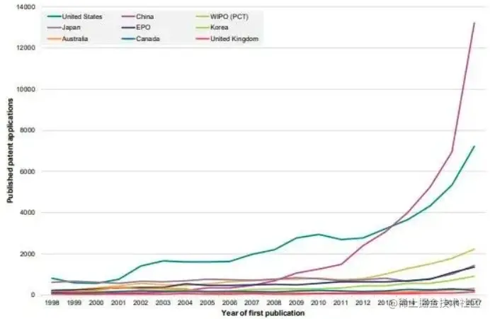 2019年,英国的IPO发布了一份关于全球AI专利活动的报告显示,自2014年以来,中国AI专利申请数赶超美国,此后一直保持高增长率。