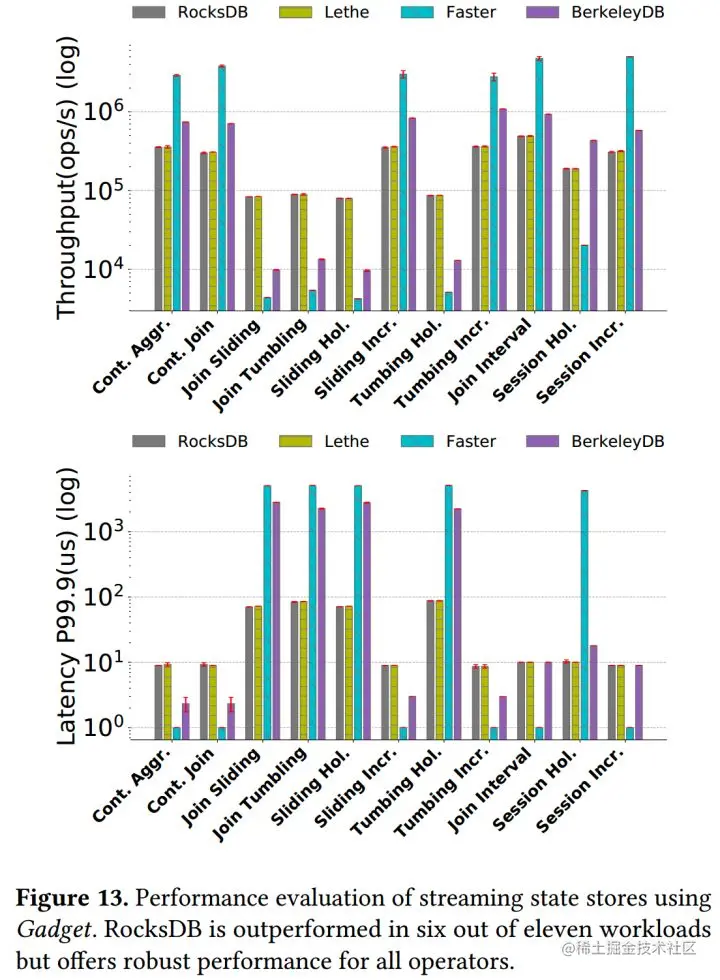使用 Gadget 分析了四个不同的 KV 存储在流处理场景下的性能,发现RocksDB 在不同情况下的性能都很稳定,但在近半的测试中表现得不如 FASTER 和BerkeleyDB 好。