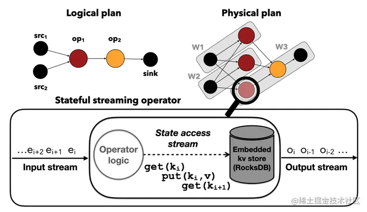 根据状态对象触发这个状态机,生成若干状态访问请求。所以,一个事件能生成一个或者多个(比如有 sliding window)state object,一个状态对象能生成若干个状态访问操作(比如 get-modify-write)。