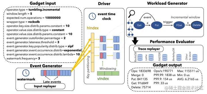 实现了 Gadget。这是一个新的 benchmark 工具,它通过模拟流处理算子的逻辑来生成逼真的状态访问 workload,再用这些状态访问 workload 对不同 KV 存储进行性能评估。