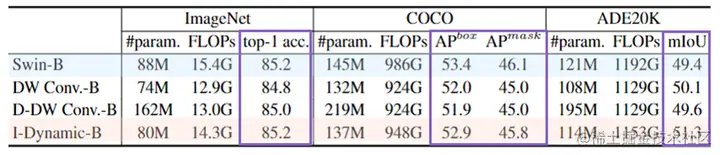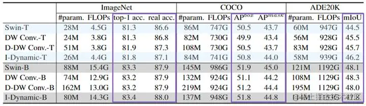 本文使用了与Swin Transformer完全相同的训练参数和网络结构,在ImageNet分类、COCO检测、ADE20K语义分割中,基于Depth-wise卷积的结构取得了和Swin Transformer相同的表现力,而Depth-wise卷积的计算开销还更小。