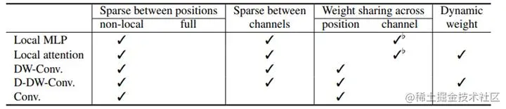 (1) 稀疏连接。不难发现,Depth-wise卷积的稀疏连接特性与Local Attention完全相同,在图像空间上局部链接,在通道上稀疏连接。