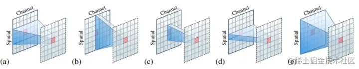 图1 (a) 卷积 (b) global attention (c) local attention、DW卷积 (d) 1x1卷积 (e) fully-connected MLP