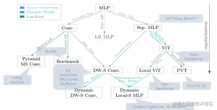 关系图中,从上到下呈现了依次增强的正则化方式或引入动态权重,随着正则化及动态权重的增加,网络的人为先验也随之增加。这种形式带来了优化上的好处,使得网络更容易训练并得到更好的结果,现有实验结果也同样验证了此项结论。最终这种稀疏化与动态性上的演进,会走向基于Depth-wise卷积的动态卷积,结合现代Large kernel的训练原则,将能够实现更好的表现效果。