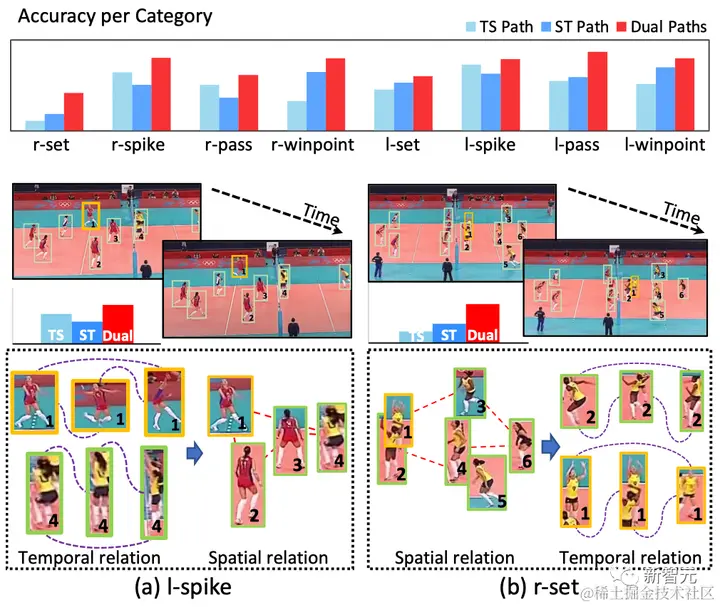 而在图(b)中,个体2和个体1都在进行起跳(一个佯攻,一个传球)的动作,如果先进行时间建模,则会混淆后续的空间建模和群体行为判定;反而,先进行空间建模,可以更好地得到同侧队友之间的场景信息和空间关系,进一步的时间建模,可以更好地区分个体1和个体2的起跳行为,进而得到正确的群体行为分类。