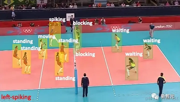 以下面排球比赛视频为例,算法需要分析场上12位运动员的动作、交互以及场景内容,综合判断得到场上在进行左侧击球(left-spike)群体行为。