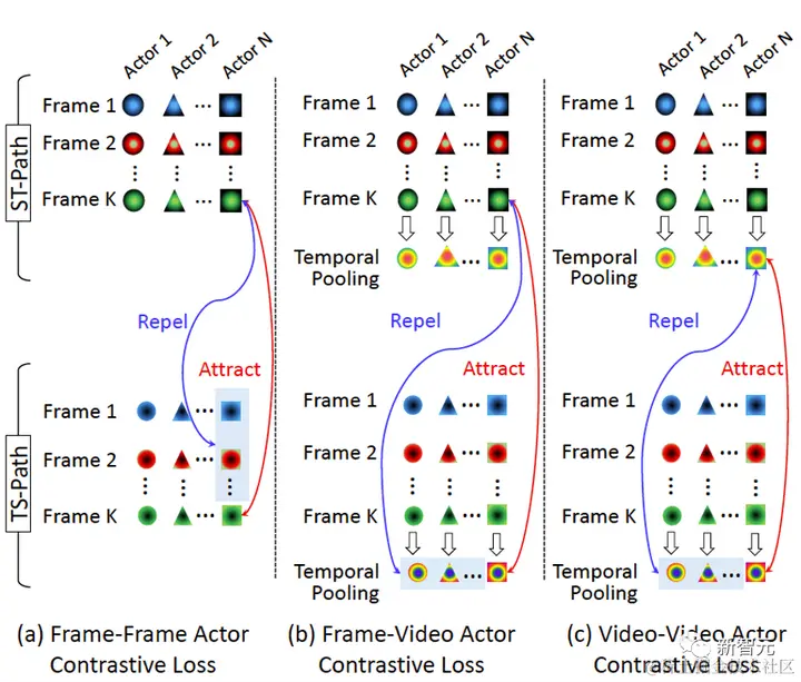 如图3所示,作者提出个体在帧(Frame)级别和视频(Video)级别特征表达在不同建模分支间的对比损失关系,即帧-帧(F-F,Frame-Frame)、帧-视频(F-V,Frame-Video)和视频-视频(V-V,Video-Video)。