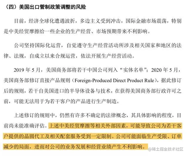 上述修订的规则中,仍然有许多不确定的法律概念,其具体影响的程度,目前尚未能准确评估。上述中美经贸摩擦等相关外部因素,可能导致公司为若干客户提供的晶圆代工及相关配套服务受到一定限制。公司可能面临生产受限、订单 减少的局面,进而对公司的业务发展和经营业绩产生不利影响。