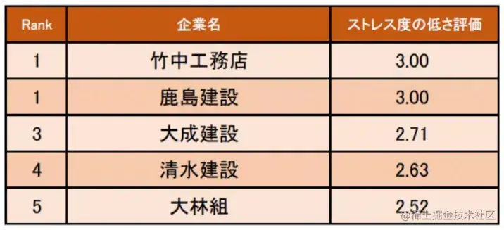 除了大林组和鹿岛建设,日本五大建筑巨头还包括大成建设、清水建设、竹中工务店。它们不仅均为百年老店(竹中工务店始于1610年),也代表着日本乃至世界先进的建筑水平。 今年年初,以收集企业口碑和公开企业工资单闻名的网站 careerconnection 公布了日本建筑行业“低工作压力企业”统计排名。五大巨头位居前列,而工作舒适度很大程度上得益于自动化技术的采纳。