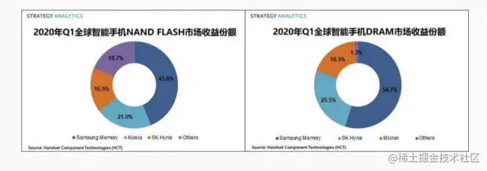 长期以来,这两块市场都被三星存储(Samsung Memory)、美光(Micron)、SK海力士(SK Hynix)三大巨头霸占。据Strategy Analytics报告,2020Q1三大厂商占据了智能手机存储芯片市场近84%的收益份额,仅三星一家就占了50%的收益。
