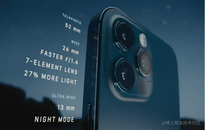 与去年的iPhone 11 Pro机型一样,Apple再次在iPhone 12 Pro上提供三摄像头系统,该系统具有12兆像素宽,长焦和超宽镜头。广角相机现在提供了更快的ƒ/ 1.6光圈,苹果公司表示,该功能可将弱光性能提高27%,而52毫米焦距远摄现在可以提供4倍光学变焦。