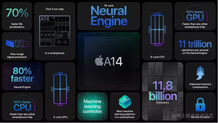 先进的制程工艺,可以让我们在同样的空间内集成更多的晶体管(多达118亿个),神经网络引擎也因此增大了一倍,扩大到了16核,机器学习算力达到了11TOPS,相较上代提升80%。