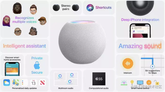 HomePod mini配备了Apple S5芯片(在Apple Watch Series 5中首次亮相)。该芯片允许进行「计算音频」处理,调节音乐每秒发声180次的方式。多个HomePod迷你扬声器还可以同步播放音乐,放在同一房间时可以「智能」地创建立体声配对。