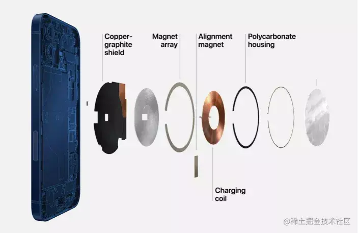 iPhone 12背面有很多层,例如磁力计、铜石墨屏蔽层、两个屏蔽层、多层磁体、NFC天线等等。