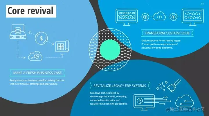 趋势是,一些开拓性的公司正在用巧妙的外包来重塑传统业务,以促进现代化改造。另外,也有一些公司正探索将核心资产转移到强大的平台中,包括低代码选项。最后,许多公司正在通过解决ERP系统的技术债务和将非必要的功能转移到其他平台。在不确定的环境下,这些从传统核心资产中获取更多价值的创新方法可能很快会成为每位CIO(首席信息官)数字化转型手册的标准组成部分。