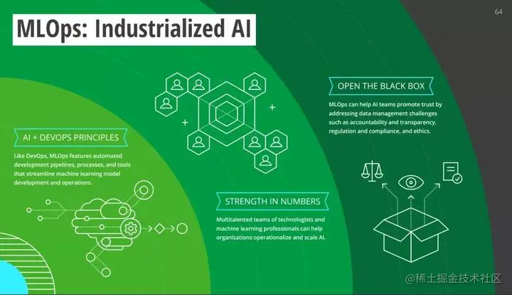 然而,由于笨拙、脆弱的开发和部署过程,阻碍了产品团队、操作人员和数据科学家之间的协作。随着AI和ML技术的成熟,大量的工程和操作规程可以帮助组织克服这些障碍,有效地扩展AI,以实现业务转型。为了实现AI和ML更广泛的变革性收益,手工人工智能时代必须让位于自动化、工业化的洞察力。MLOps(也被称为ML CI/CD、ModelOps和ML DevOps):DevOps工具和方法在模型开发和交付中的应用,能够在开发和部署阶段,实现机器学习的工业化和规模化。