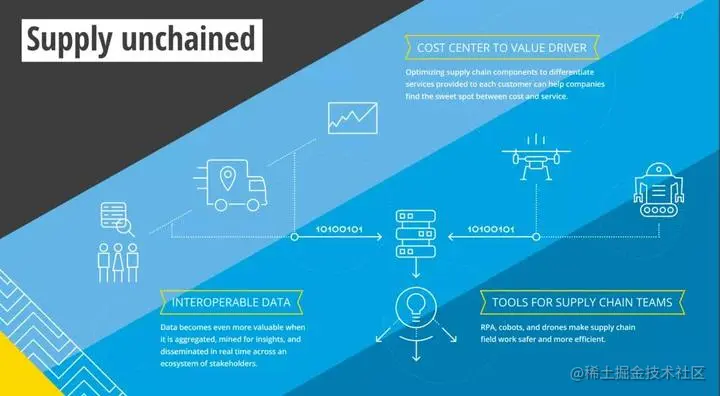 长期以来,供应链一直在考虑做生意的成本,现在正走出后台,进入客户细分和产品差异化的价值前线。面向未来的制造商、零售商、分销商及其他人正在探索如何释放供应链的价值,将其从成本为中心转变为以客户为中心。他们正在收集、分析整个供应网络中共享的数据,以获取更多价值。比如,一些组织正在探索使用机器人、无人机及图像识别等,使得物理供应链交互对员工更加高效、安全。
