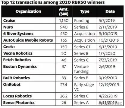 在今年入选的RBR 50榜单中,有不少在过去一年中获得大额融资。Robotics Business Review披露了这其中最大的12笔交易,主要聚焦在自主移动机器人、自动驾驶汽车、末端操作器、传感器和工业自动化领域。