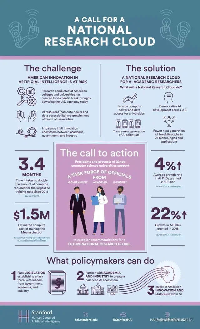 为此,斯坦福大学HAI在还负责牵头,联合了美国22家顶尖大学向美国总统特朗普和国会递交了一封信,呼吁由联邦政府领导创建一个「国家研究云」,为美国的人工智能(AI)研究提供支持,维持美国在人工智能研究领域的领先地位。