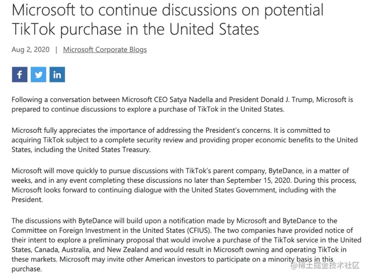 美东时间 8 月 2 日,微软在官方博客中发布新闻稿,表示将继续就收购 TikTok 进行相关讨论,并在 9 月 15 日前完成讨论。
