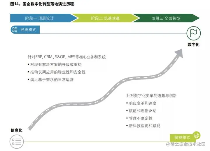 数字化转型是一个长期的过程,难以一蹴而就,具体实施过程中需要综合应用面向稳态需求的经典实施模式和面向创新需求的敏捷模式,并按照顶层设计进行统筹管理。
