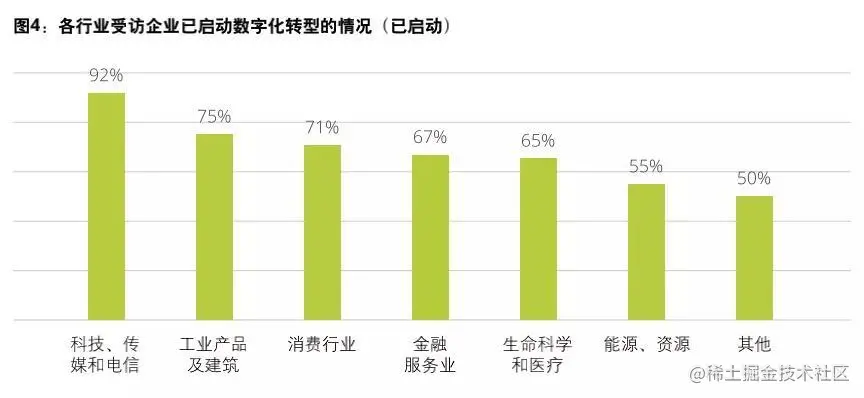 据调查报告显示,目前超六成受访企业已经启动数字化转型,外企和央企中已经启动的比例更高;从行业来看,科技、传媒和电信行业、工业产品及建筑业、消费行业的企业领跑数字化转型进程。
