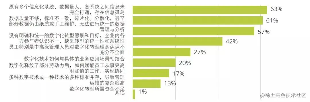 最后,受访企业认为数字化转型面临的三大挑战是:原有多个信息化系统的整合利用、数据质量和可用性、缺乏统一的数字化转型愿景和目标。